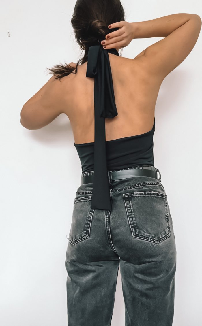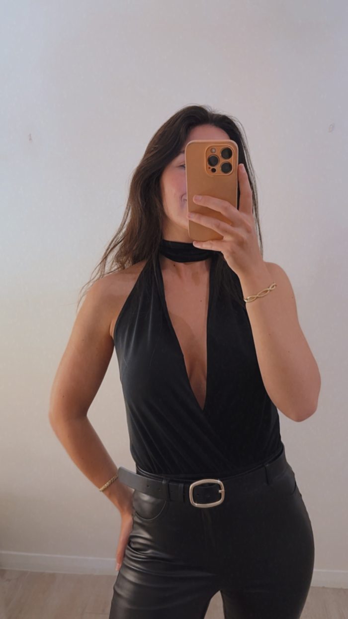 Body con escote en V y un choker ancho que eleva totalmente el outfit.