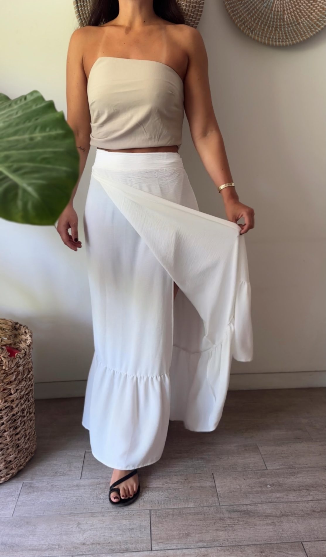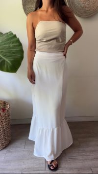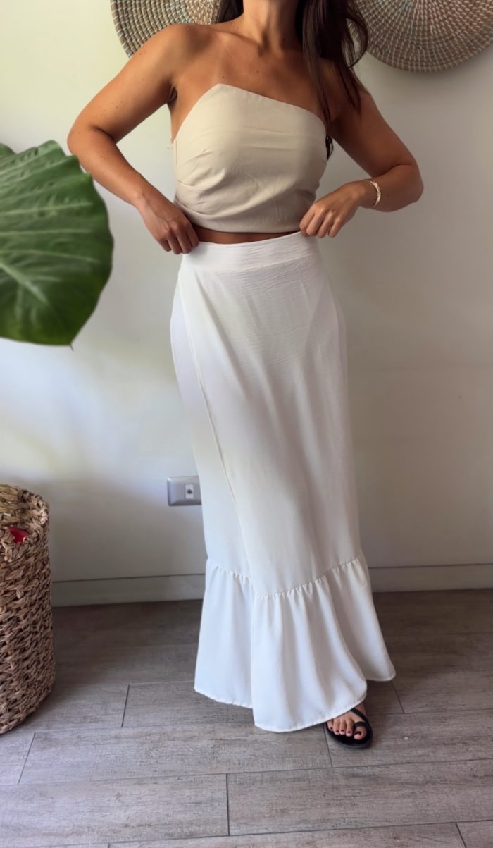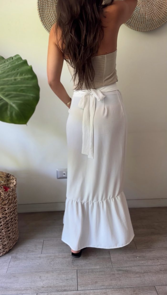 Talla única | Largo total 94 cm | Ancho total de la falda 130 cm (recuerden que es tipo pareo, envolvente). Ojo, al ser color blanco se recomienda usarla con ropa interior clara, ya que se puede traslucir.