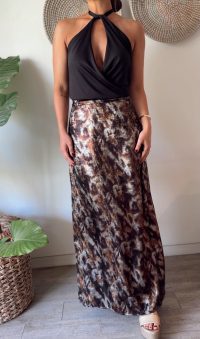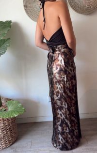 Precioso este estampado en tonos café metalizados! Esta falda es envolvente, se amarra como un pareo, por lo que puedes ajustarla a tu medida. En las fotos, la combinamos con nuestro top Creta.
