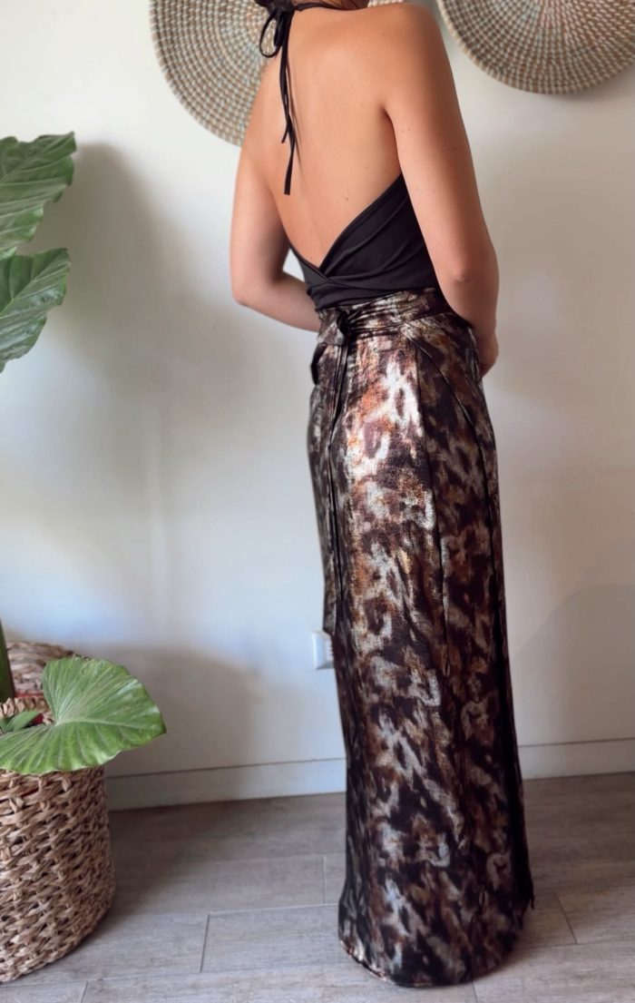 Precioso este estampado en tonos café metalizados! Esta falda es envolvente, se amarra como un pareo, por lo que puedes ajustarla a tu medida. En las fotos, la combinamos con nuestro top Creta.